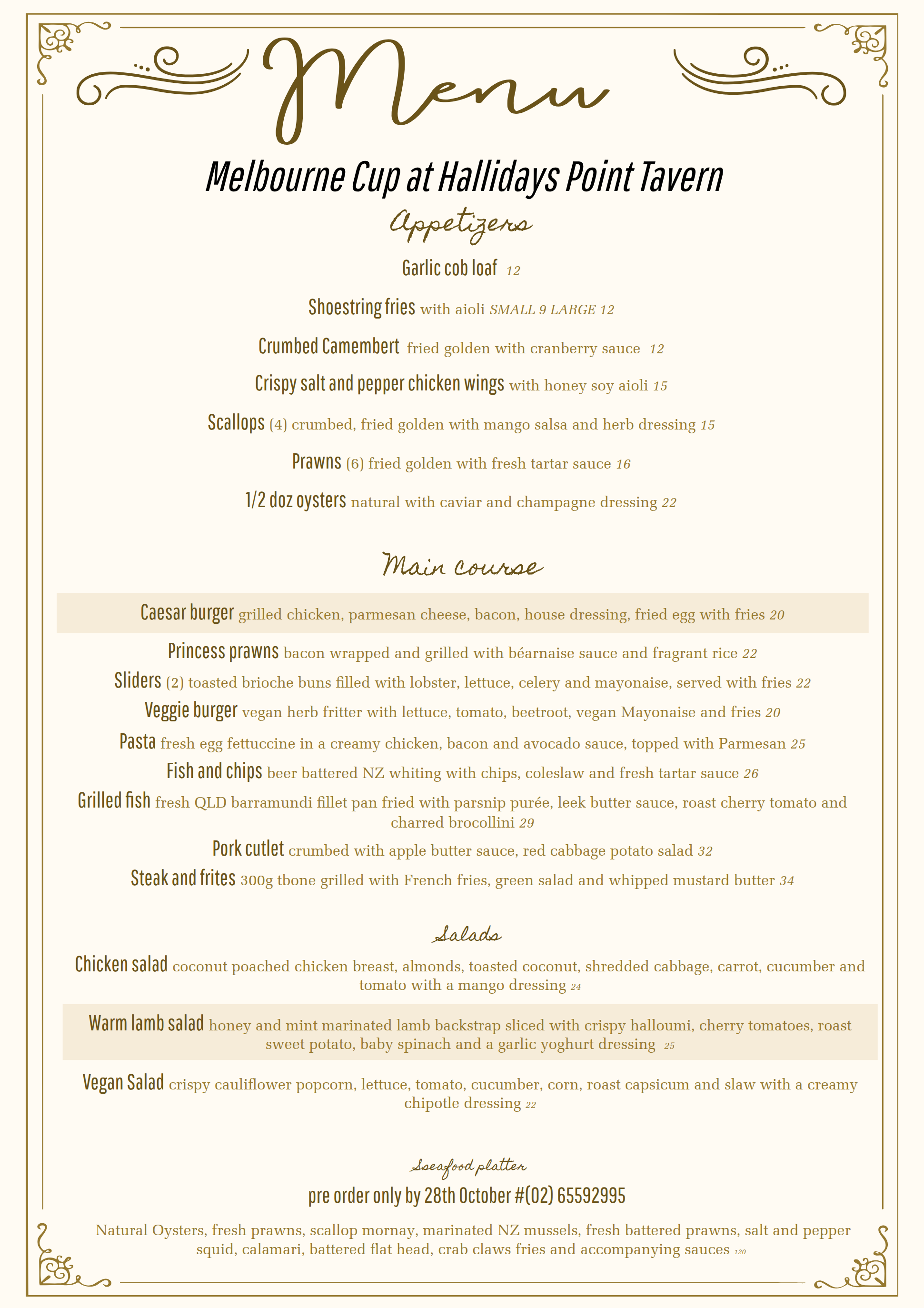 Chef's Melbourne Cup Lunch Menu available from 12pm - 2pm.